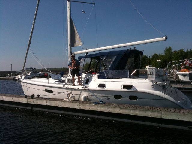 Well, our shakedown cruise was fairly good even though we had a little setback. The warning light for overheating the engine came on and it looked like things were overheating. Dennis ran down below and checked various parts of the boat, returned on deck and announced that it was impossible so we carried on even though the shrieking sound was quite unbearable. Eventually it stopped and we motored on. The explanation had something to do with an air bubble. Whatever – all is good now and we are sitting at Bob’s Point Marina enjoying the good weather and waiting for friends to arrive with pizza (wouldn’t want to strain ourselves!)