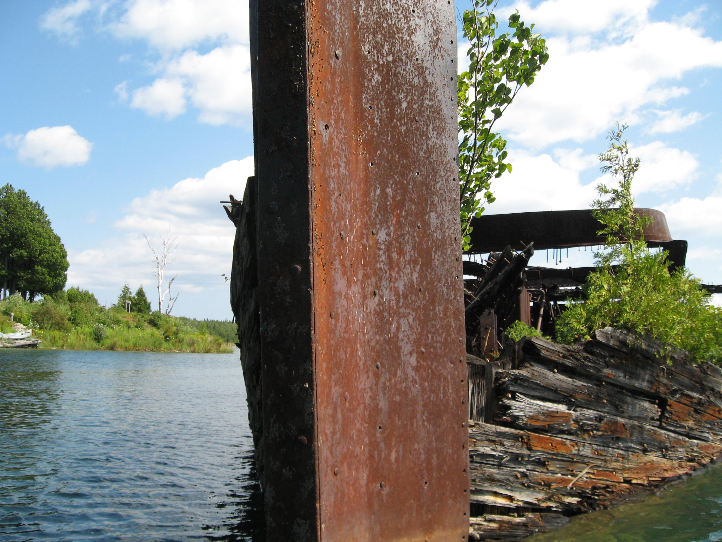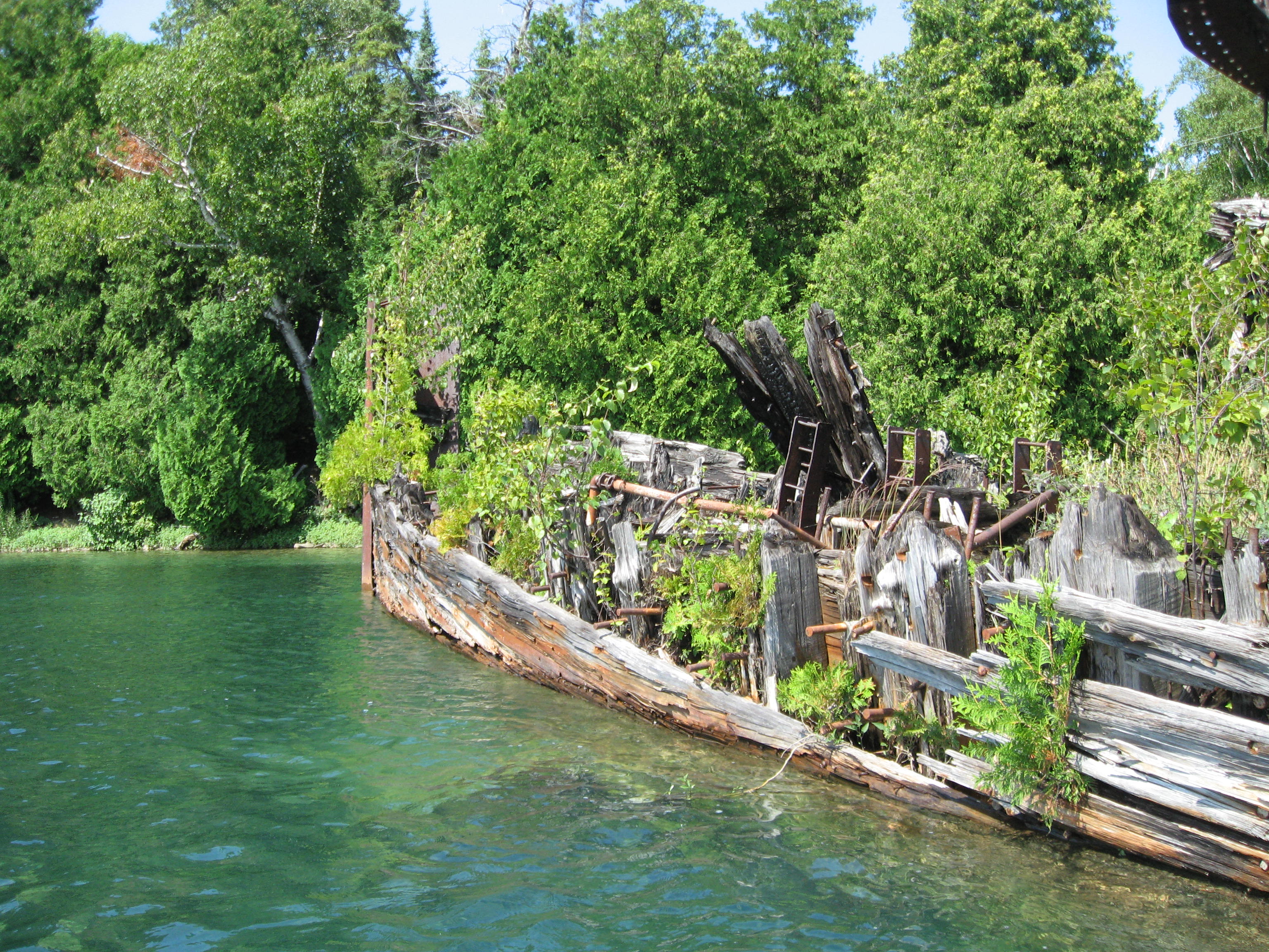A really interesting anchorage that we stayed at is Wingfield Basin. It is near Cabot Head on the Bruce Peninsula. On the right-hand side of the anchorage is an abandoned burned out ship, half submerged in the water. Nature is taking over though and grass, shrubs, and critters are turning it into their homes. Dennis spotted a big black snake in the stern.