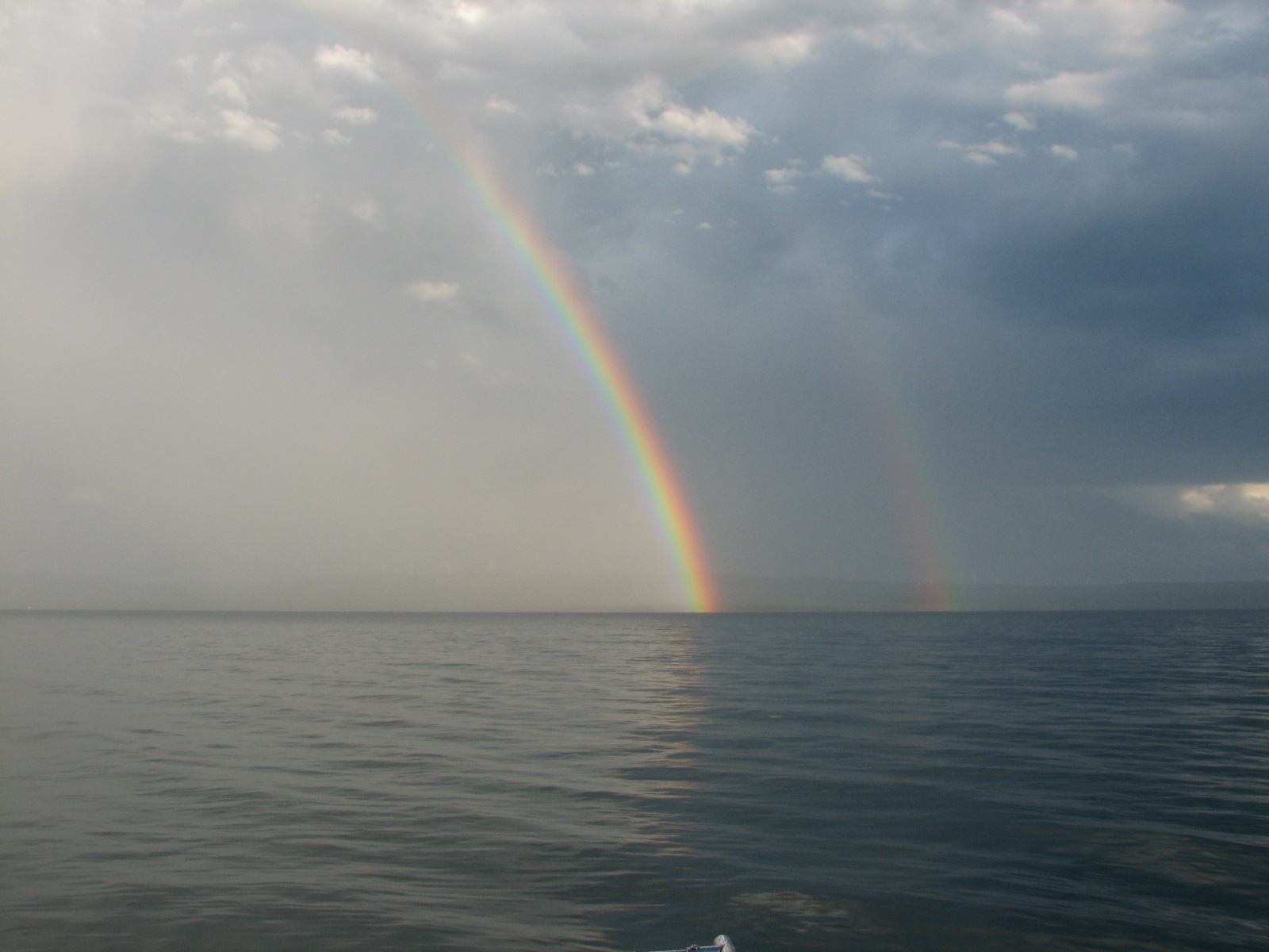 We did some swimming and fishing and of course, I went aqua-jogging. The water was cooler than usual but certainly bearable. We just started supper, when a storm came upon us. There was all sorts of thunder and lightening for ten minutes and then the sky cleared and a double rainbow appeared. Too cool!