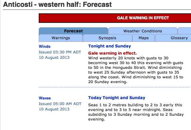 It looks like we are staying today. The sun has come out but the winds are pretty fierce and we wouldn’t even be able to get off the dock without causing all sorts of havoc, so we will stay today. Our weather is not as bad as Jim and Sharon’s – our friends who are in Gaspé. Here is their marine forecast – yikes!
