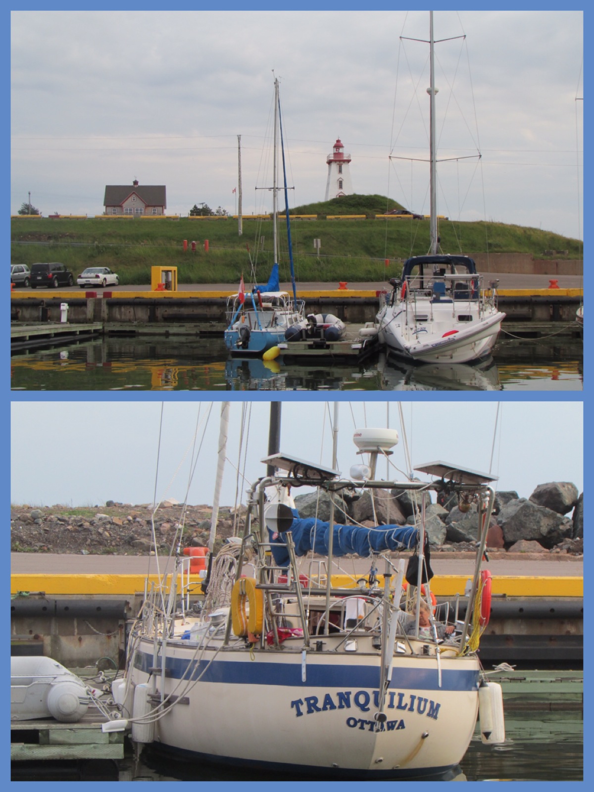 We might be leaving tomorrow as the weather looks good. Today, Dennis worked on the generator with no luck. He had to order a pump and the man is going to Charlottetown today and will drop it off tonight. After several hours of working on it, he gave up and decided to became a spectator for another boat’s mast operation. Kim, the lady at the top of the mast, had to go and fix something. Yesterday, she was at the top for well over an hour but was unsuccessful. Dennis then gave it a try but he too was unsuccessful. So today, Kim tried again and I think she was able to fix whatever needed fixing.
