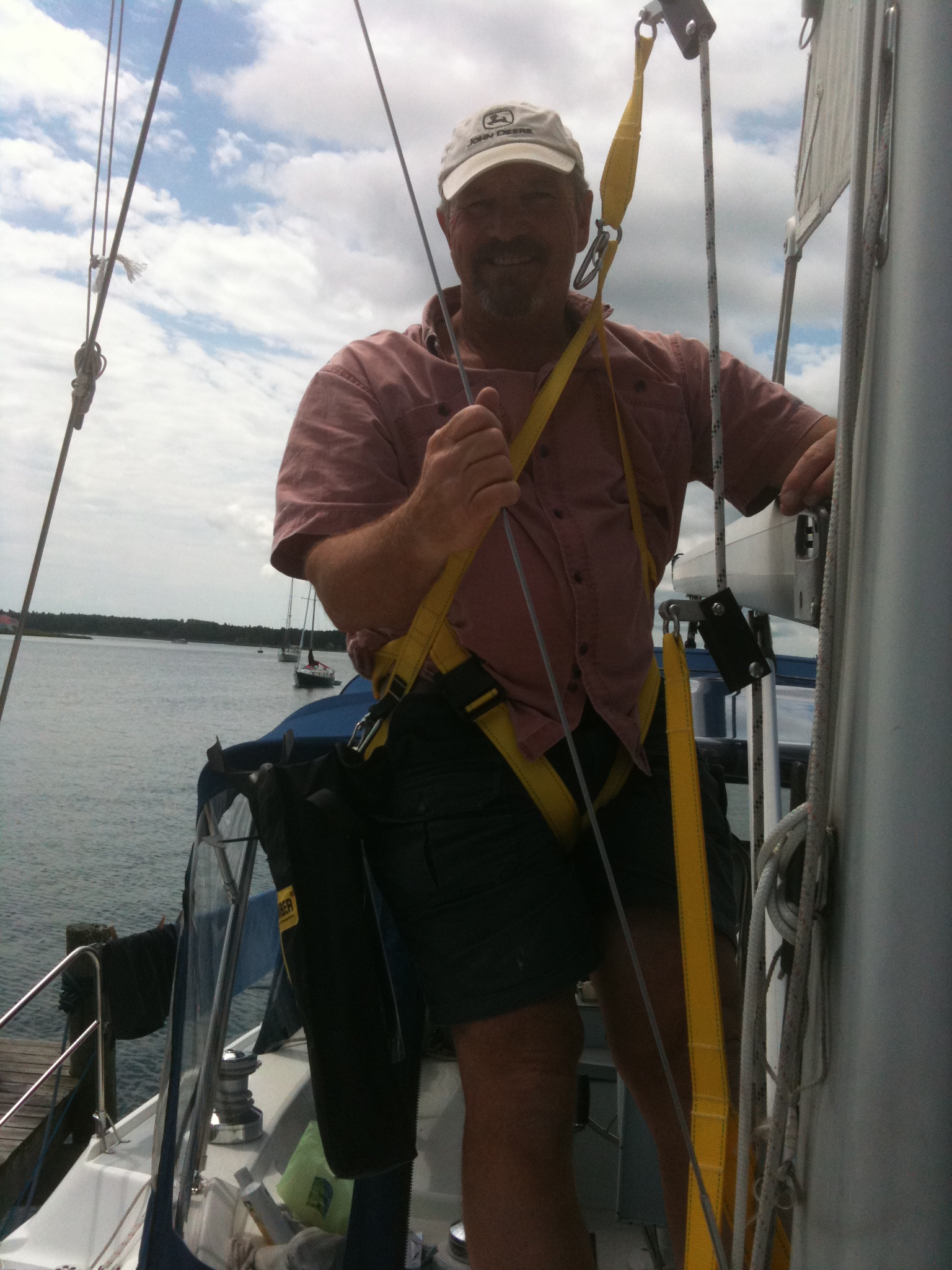 In the spring of 2010, we bought a new battery and had it shipped up from the US at a cost of $90. Then, Dennis had to climb the mast himself and  bought a really neat mast climber (this cost $400) and install the new battery. Of course, it turned out not to be a battery problem because the Nexus would not work. We called ComNav and they referred us to Ocean Equipment. We called Ocean Equipment and had the Nexus shipped out there (another $100). Dave, the man we dealt with repaired it but told us that there was water damage in the WSI box. Since it was always under the dodger and inside a plastic box, we found this hard to believe. To make a long story short, the replacement WSI box was $300!