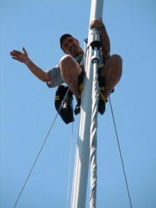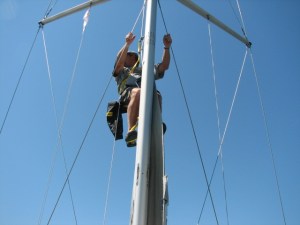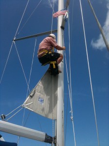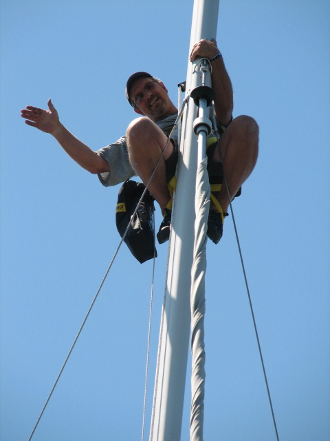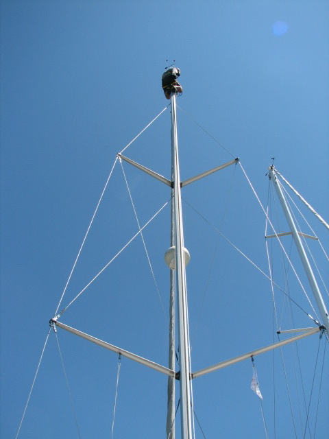 Steve dropped it off at the boat this morning and Dennis climbed the mast to install it. He had to go up twice – the first time, he couldn’t quite reach the top and had to come all the way down to adjust something on his climbing gear. The second time worked and he attached the wind instrument to the top of the mast and then dropped the wire down through it (actually tied it to a little string and I pulled it through). It was only about 100 degrees out! Here are a couple of pictures of him as well as a video. (Click this link for the video).