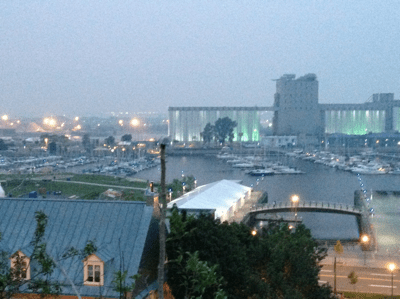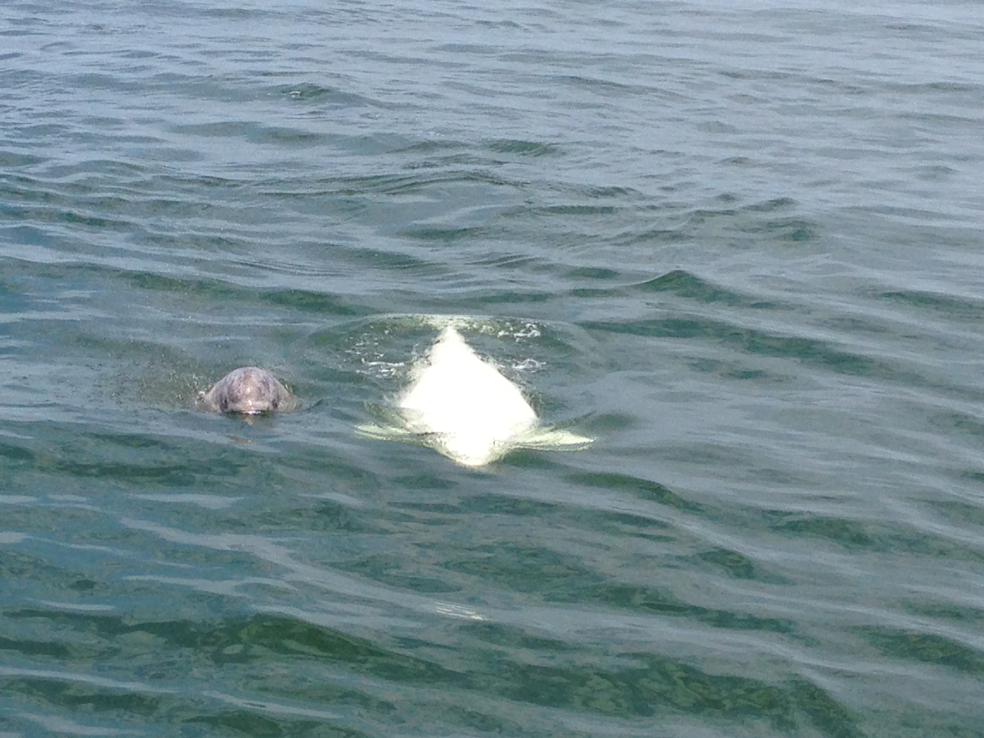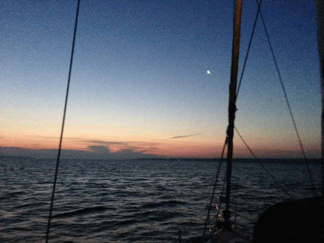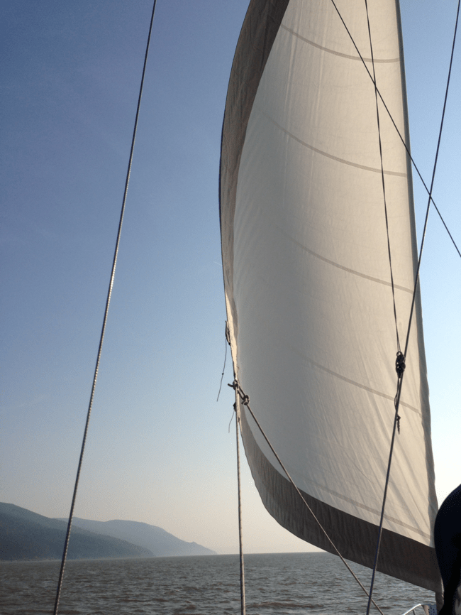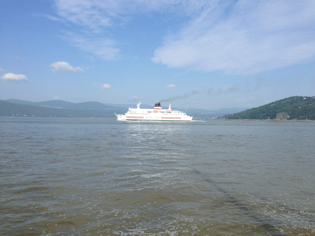 The wind was in our favour this morning when we left at 5:15 am. It was very light and coming from the south west so we knew we had an easy to Matane. It was extremely uneventful – we only saw one very large beluga on the way. I made Dennis listen to the CBC (Q with Jian Ghomeshi) and it was a nice way to pass the time sailing down the St. Lawrence. Along the coast, are hundreds and hundreds of giant windmills – I’m sure they were going full bore yesterday but today, they were just moving slowly.