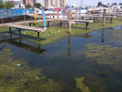 We have arrived safely in Windsor. Actually, we passed Windsor a couple of hours ago and are in LaSalle – which is south of the Ambassador Bridge. We originally planned to stay at Lakeview Marina, but because of their problem with weeds (see picture below), there wasn’t enough room for us. The marina had to clean out each well with a machine that resembled a combine.